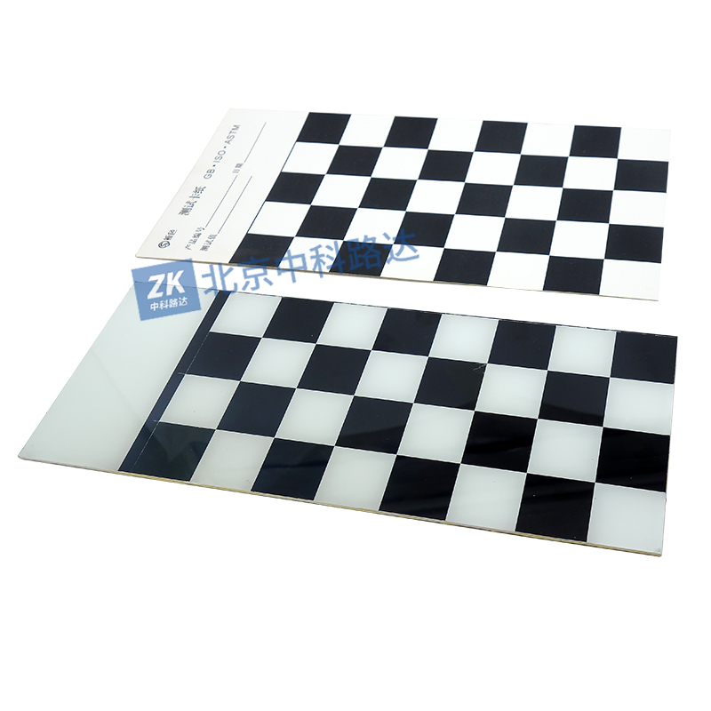 本方法是利用遮蓋住底面所需要的最小濕膜厚度來測定色漆的遮蓋力,所得到結(jié)果以μm(微米)表示。該儀器由一塊一半黑色一半白色的底板組成,黑色和白色部分沿著邊緣都刻有0~50mm的刻度。儀器隨機配有兩塊透明的玻璃面板,這些透明面板之間的區(qū)別在于它們的兩個精密加工的金屬支撐柱的長度, 放置在底板上后可以讓面板和底板之間形成不同角度,這個鍥形角度被給定一個固定的系數(shù)K,其范圍從最小角度K=0.002到K=0.0035,K=0.004,K=0.007,最大為K=0.008測試時根據(jù)涂料特性選擇合適系數(shù)K的面板,通常淺色涂料選用K=0.008,深色涂料選用K=0.004。將一滴涂料放在靠近底板中部的黑白分界處,用力壓緊透明面板將涂料展開成薄的楔形,楔形將隨面板的移動而動。來回移動面板,直到通過面板和涂層觀察到的黑白界線剛好消失,從黑板或白板刻度上記下此時刻度讀數(shù),然后乘以所用面板楔形系數(shù)K,,所得到的值即為該涂料最小的遮蓋厚度(用毫米表示)。