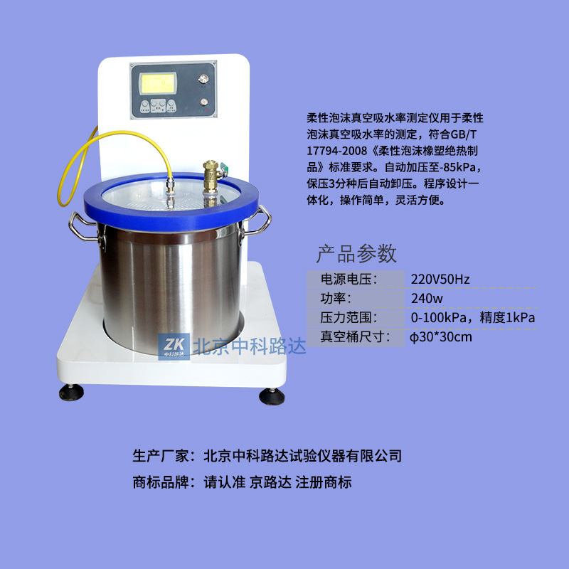 柔性泡沫真空吸水率測定儀用于柔性泡沫真空吸水率的測定,符合GB/T 17794-2008《柔性泡沫橡塑絕熱制品》標(biāo)準要求。自動加壓至-85kPa,保壓3分種后自動卸壓。程序設(shè)計一體化,操作簡單,靈活方便。