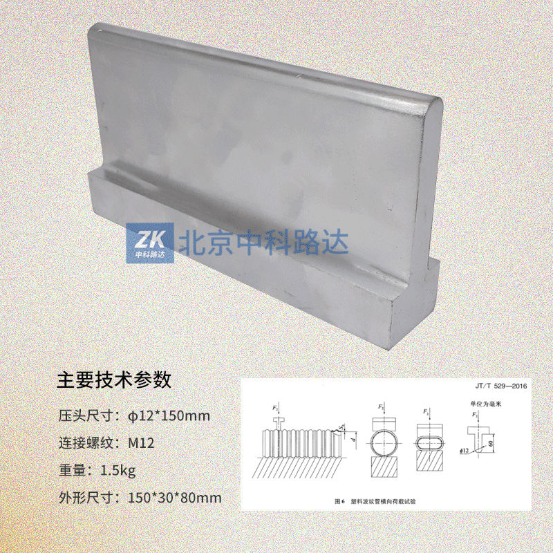 本產(chǎn)品符合JT/T529-2016《預(yù)應(yīng)力混凝土橋梁用塑料波紋管》的規(guī)定要求,用于塑料波紋管橫向荷載試驗(yàn)。