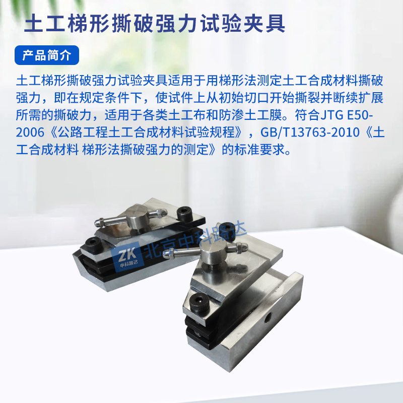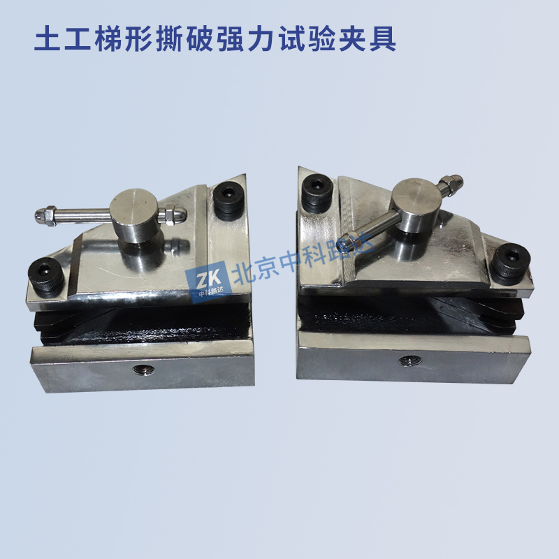 土工梯形撕破強力試驗夾具適用于用梯形法測定土工合成材料撕破強力,即在規(guī)定條件下,使試件上從初始切口開始撕裂并斷續(xù)擴展所需的撕破力,適用于各類土工布和防滲土工膜。符合JTG E50-2006《公路工程土工合成材料試驗規(guī)程》,GB/T13763-2010《土工合成材料 梯形法撕破強力的測定》的標準要求。