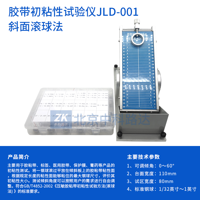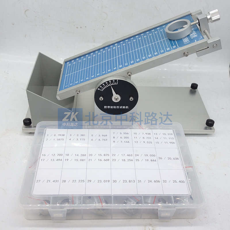 主要用于膠粘帶、標簽、醫(yī)用膠帶、保護膜、膏藥等產(chǎn)品的初粘性測試。將一鋼球滾過平放在傾斜板上的膠粘帶粘性面,根據(jù)規(guī)定長度的粘性面能夠粘住的最大鋼球尺寸,評價其初粘性大小。測試傾斜角度可以按照用戶的需求進行自由調整。符合GB/T4852-2002《壓敏膠粘帶初粘性試驗方法(滾球法) 》的標準要求。