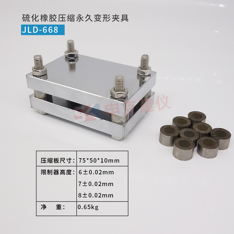 一、產(chǎn)品簡(jiǎn)介 本裝置用于測(cè)定硫化橡膠的恒定形變壓縮永久變形特性,適用于評(píng)價(jià)硫化橡膠在規(guī)定的溫度和壓縮率條件下,經(jīng)持續(xù)壓縮后保持其彈性的能力。符合GB/T 1683-2018《硫化橡膠 恒定形變壓縮永久變形的測(cè)定方法》的標(biāo)準(zhǔn)要求。二、主要技術(shù)參數(shù)1、壓縮板尺寸:75*50*10mm2、限制器高度:60.02mm,70.02mm,80.02mm3、凈重:0.65kg...