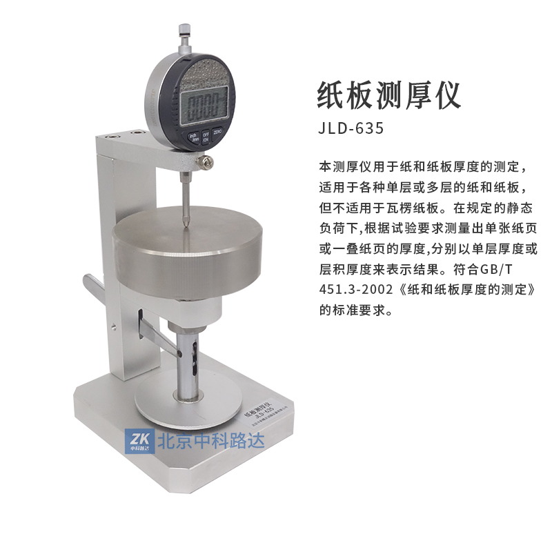 本測(cè)厚儀用于紙和紙板厚度的測(cè)定, 適用于各種單層或多層的紙和紙板,但不適用于瓦楞紙板。在規(guī)定的靜態(tài)負(fù)荷下,根據(jù)試驗(yàn)要求測(cè)量出單張紙頁(yè)或一疊紙頁(yè)的厚度,分別以單層厚度或?qū)臃e厚度來(lái)表示結(jié)果。符合GB/T 451.3-2002《紙和紙板厚度的測(cè)定》的標(biāo)準(zhǔn)要求。