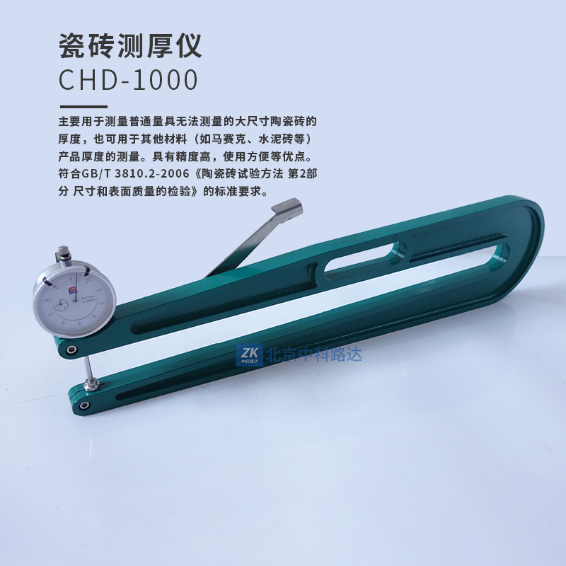主要用于測量普通量具無法測量的大尺寸陶瓷磚的厚度,也可用于其他材料(如馬賽克、水泥磚等)產(chǎn)品厚度的測量。具有精度高,使用方便等優(yōu)點。符合GB/T 3810.2-2006《陶瓷磚試驗方法 第2部分 尺寸和表面質(zhì)量的檢驗》的標(biāo)準(zhǔn)要求。
