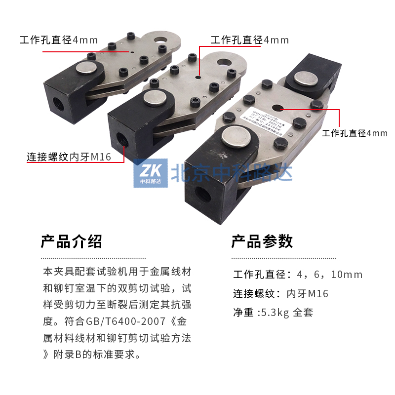 本夾具配套試驗(yàn)機(jī)用于金屬線材和鉚釘室溫下的雙剪切試驗(yàn),試樣受剪切力至斷裂后測定其抗強(qiáng)度。符合GB/T6400-2007《金屬材料線材和鉚釘剪切試驗(yàn)方法》附錄B的標(biāo)準(zhǔn)要求。