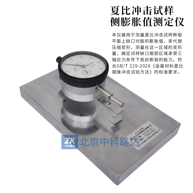 本儀器用于測量夏比沖擊試樣斷裂平面上缺口對面的膨脹值,來代替壓縮變形,測量在這一區(qū)域的變形量,確定試樣缺口根部區(qū)域承受三軸應(yīng)力條件下抵抗斷裂的能力。符合GB/T 229-2020《金屬材料夏比擺錘沖擊試驗(yàn)方法》的標(biāo)準(zhǔn)要求。
