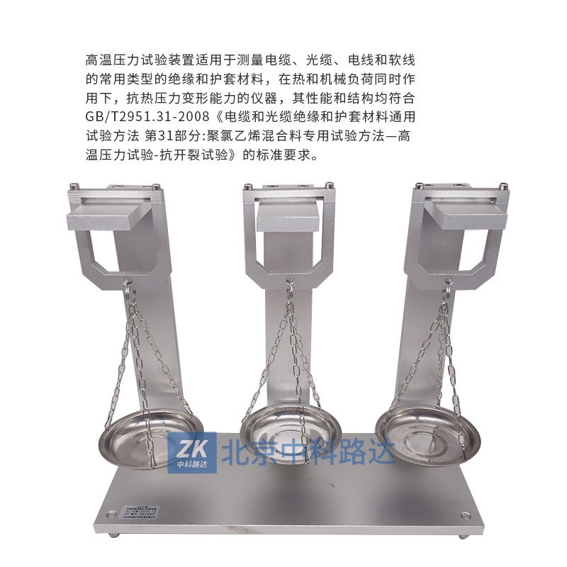 高溫壓力試驗(yàn)裝置適用于測量電纜、光纜、電線和軟線的常用類型的絕緣和護(hù)套材料,在熱和機(jī)械負(fù)荷同時(shí)作用下,抗熱壓力變形能力的儀器,其性能和結(jié)構(gòu)均符合GB/T2951.31-2008《電纜和光纜絕緣和護(hù)套材料通用試驗(yàn)方法 第31部分:聚氯乙烯混合料專用試驗(yàn)方法—高溫壓力試驗(yàn)-抗開裂試驗(yàn)》的標(biāo)準(zhǔn)要求。