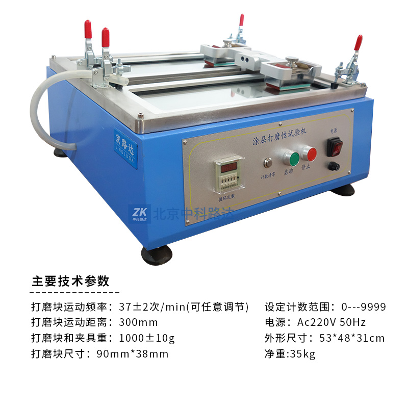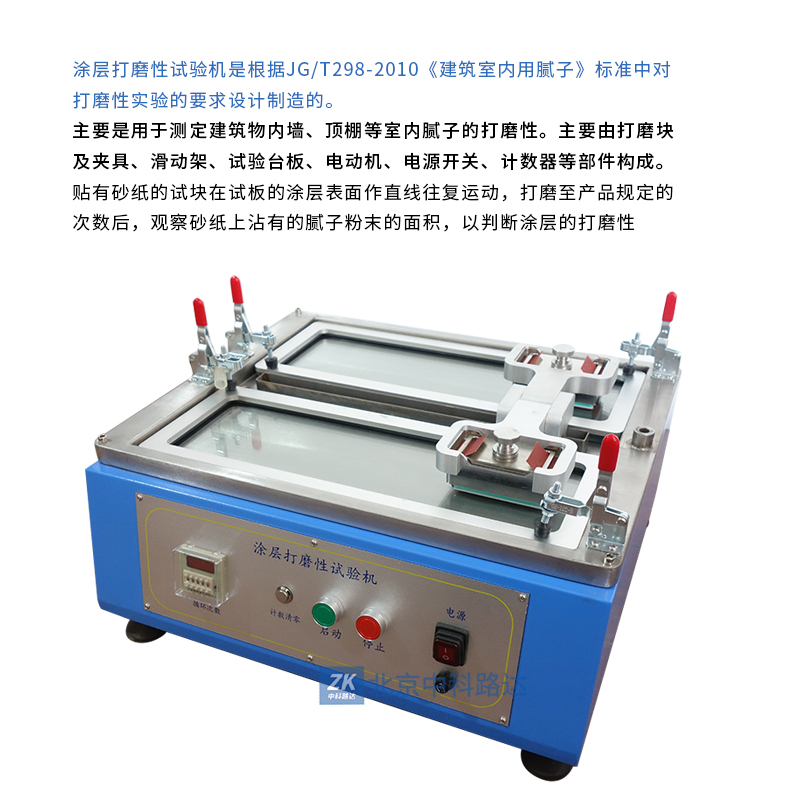涂層打磨性試驗機是根據(jù)JG/T298-2010《建筑室內(nèi)用膩子》標準中對打磨性實驗的要求設計制造的。主要是用于測定建筑物內(nèi)墻、頂棚等室內(nèi)膩子的打磨性。主要由打磨塊及夾具、滑動架、試驗臺板、電動機、電源開關、計數(shù)器等部件構成。貼有砂紙的試塊在試板的涂層表面作直線往復運動,打磨至產(chǎn)品規(guī)定的次數(shù)后,觀察砂紙上沾有的膩子粉末的面積,以判斷涂層的打磨性。
