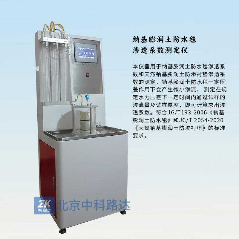 本儀器用納基膨潤土防水毯滲透系數(shù)和天然鈉基膨潤土防滲襯墊滲透系數(shù)的測定。鈉基膨潤土防水毯一定壓差作用下會產(chǎn)生微小滲流, 測定在規(guī)定水力壓差下一定時(shí)間內(nèi)通過試樣的滲流量及試樣厚度,即可計(jì)算求出滲透系數(shù)。符合JG/T193-2006《鈉基膨潤土防水毯》JC/T 2054-2020《天然鈉基膨潤土防滲襯墊》的標(biāo)準(zhǔn)要求。