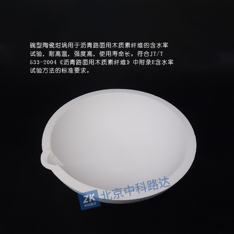 碗型陶瓷坩堝用于瀝青路面用木質(zhì)素纖維的含水率試驗(yàn),耐高溫,強(qiáng)度高,使用壽命長(zhǎng)。符合JT/T 533-2004《瀝青路面用木質(zhì)素纖維》中附錄E含水率試驗(yàn)方法的標(biāo)準(zhǔn)要求。