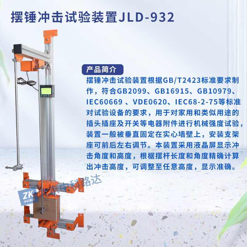 擺錘沖擊試驗(yàn)裝置根據(jù)GB/T2423標(biāo)準(zhǔn)要求制作,符合GB2099、GB16915、GB10979、IEC60669 、VDE0620、IEC68-2-75等標(biāo)準(zhǔn)對(duì)試驗(yàn)設(shè)備的要求,用于對(duì)家用和類似用途的插頭插座及開關(guān)等電器附件進(jìn)行機(jī)械強(qiáng)度試驗(yàn),裝置一般被垂直固定在實(shí)心墻壁上,安裝支架座可前后左右調(diào)節(jié)。本裝置采用液晶屏顯示沖擊角度和高度,根椐擺桿長(zhǎng)度和角度精確計(jì)算出沖擊高度,可調(diào)整至任意高度,顯示準(zhǔn)確。