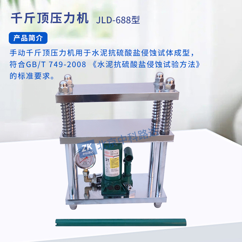 手動(dòng)千斤頂壓力機(jī)用于水泥抗硫酸鹽侵蝕試體成型,符合GB/T 749-2008 《水泥抗硫酸鹽侵蝕試驗(yàn)方法》的標(biāo)準(zhǔn)要求。