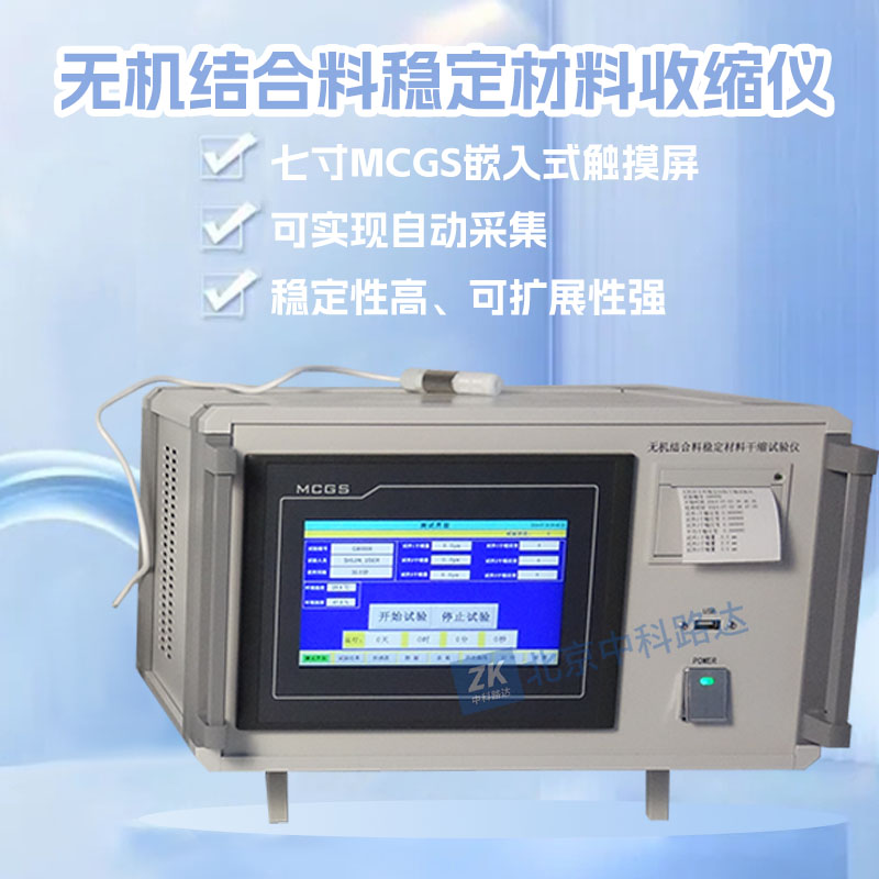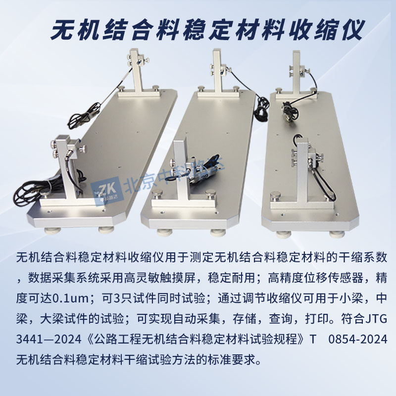 無機結(jié)合料穩(wěn)定材料收縮儀用于測定無機結(jié)合料穩(wěn)定材料的干縮系數(shù),數(shù)據(jù)采集系統(tǒng)采用高靈敏觸摸屏,穩(wěn)定耐用;高精度位移傳感器,精度可達0.1um;可3只試件同時試驗;通過調(diào)節(jié)收縮儀可用于小梁,中梁,大梁試件的試驗;可實現(xiàn)自動采集,存儲,查詢,打印。符合JTG 3441—2024《公路工程無機結(jié)合料穩(wěn)定材料試驗規(guī)程》T 0854-2024無機結(jié)合料穩(wěn)定材料干縮試驗方法的標準要求。