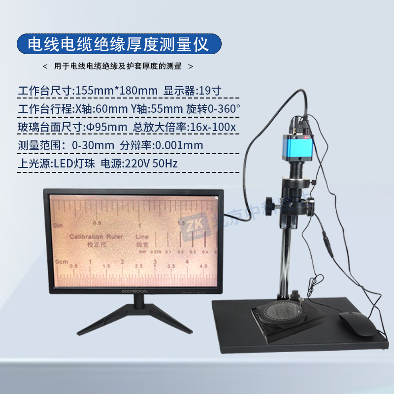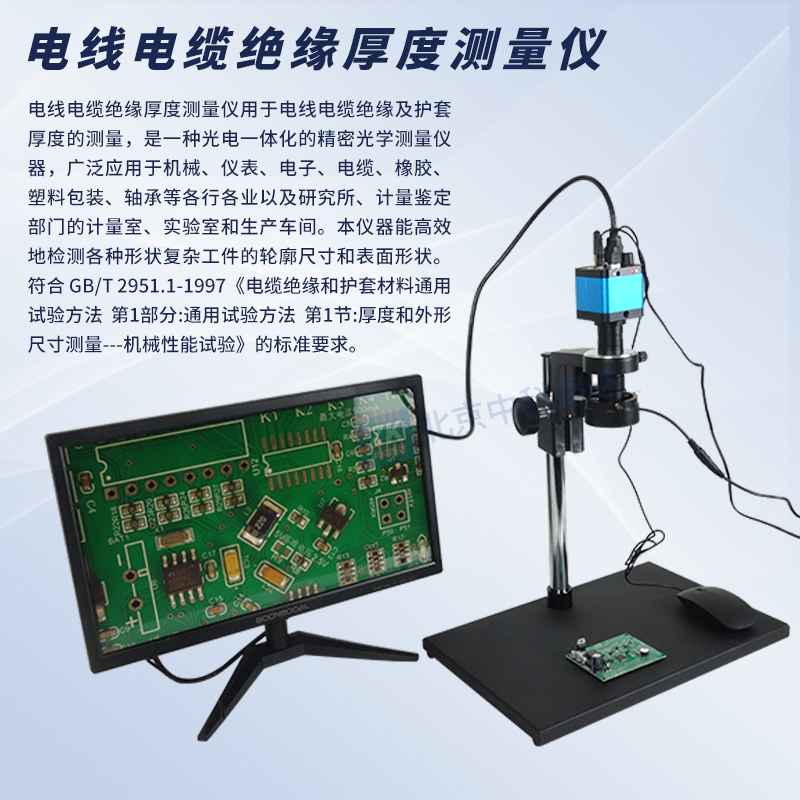 電線電纜絕緣厚度測(cè)量?jī)x用于電線電纜絕緣及護(hù)套厚度的測(cè)量,是一種光電一體化的精密光學(xué)測(cè)量?jī)x器,廣泛應(yīng)用于機(jī)械、儀表、電子、電纜、橡膠、塑料包裝、軸承等各行各業(yè)以及研究所、計(jì)量鑒定部門的計(jì)量室、實(shí)驗(yàn)室和生產(chǎn)車間。本儀器能高效地檢測(cè)各種形狀復(fù)雜工件的輪廓尺寸和表面形狀。符合 GB/T 2951.1-1997《電纜絕緣和護(hù)套材料通用試驗(yàn)方法 第1部分:通用試驗(yàn)方法 第1節(jié):厚度和外形尺寸測(cè)量---機(jī)械性能試驗(yàn)》的標(biāo)準(zhǔn)要求。